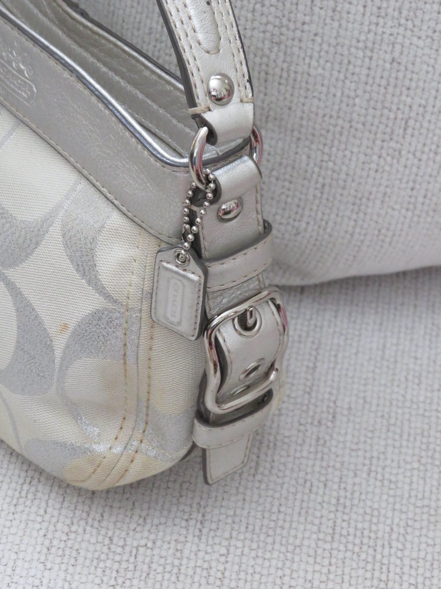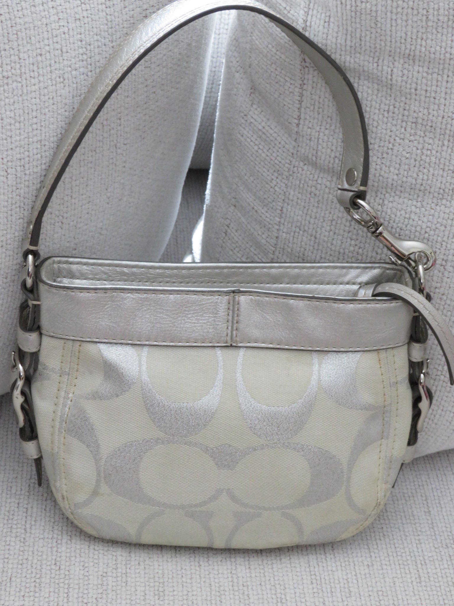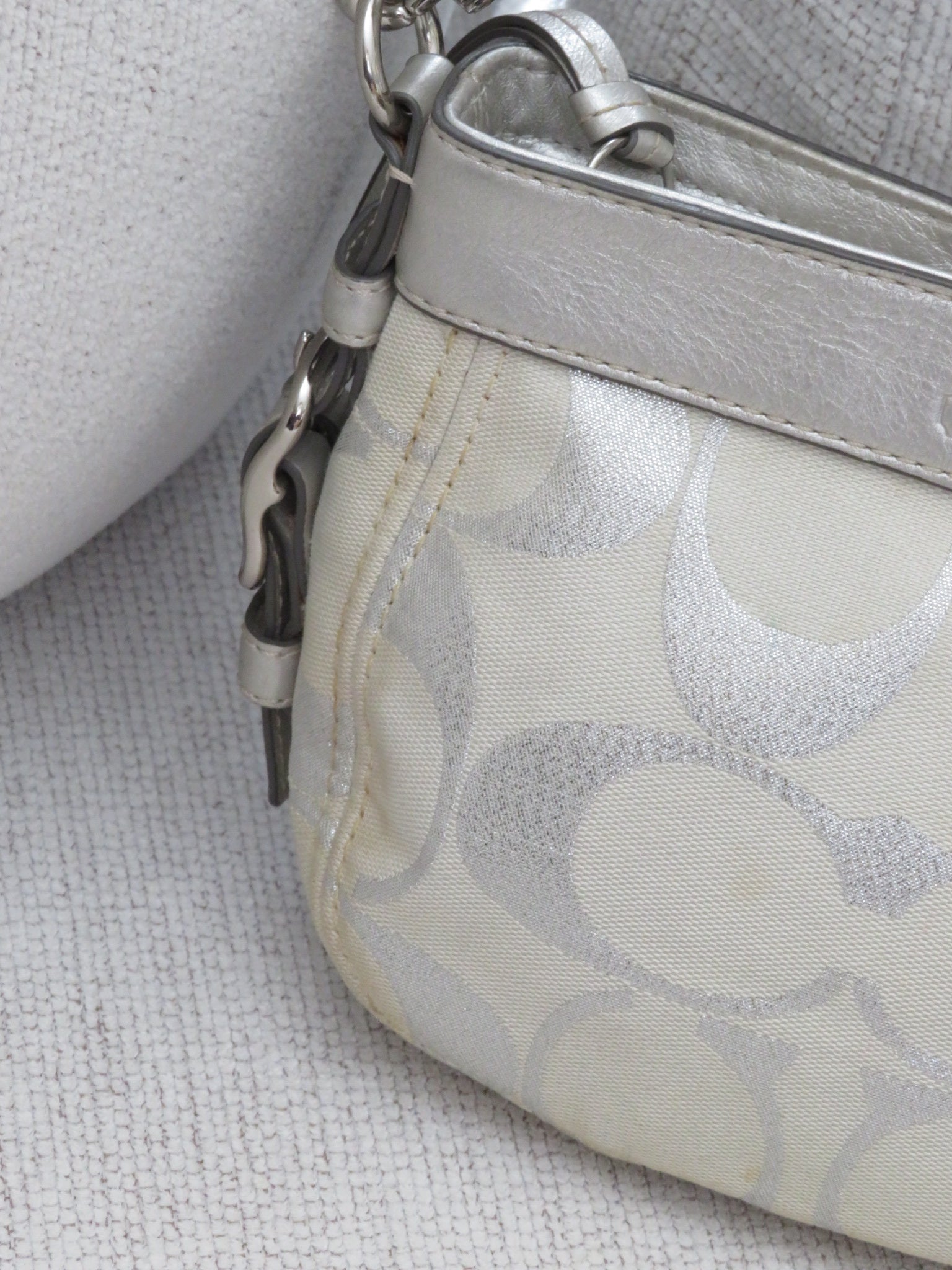 vintage mini Coach shoulder bag, monogram metallic silver and cream canvas bag!
